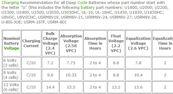 6 Volt Batteries = Daily charge 7.4v, Absorption 7.05-7.35v, Float 6.6v, Equalize 7.8v