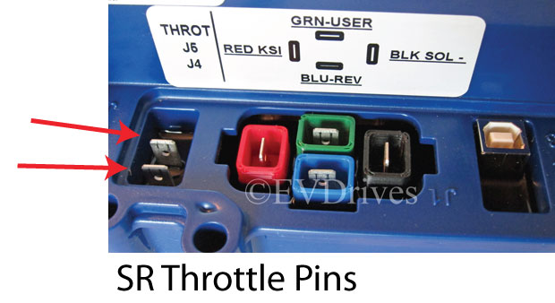 For Alltrax SR, SPM, SPB, AXE & NPX controllers, measure the voltage between the two throttle pins (see pictures below) with the key on and the peddle depress just enough to active at the foot switch. You should hear the solenoid close at this time and have a lit LED light. You should see 10 volts on the throttle pins. Press the Pedal down to the floor, full throttle and you should see 6 volts.